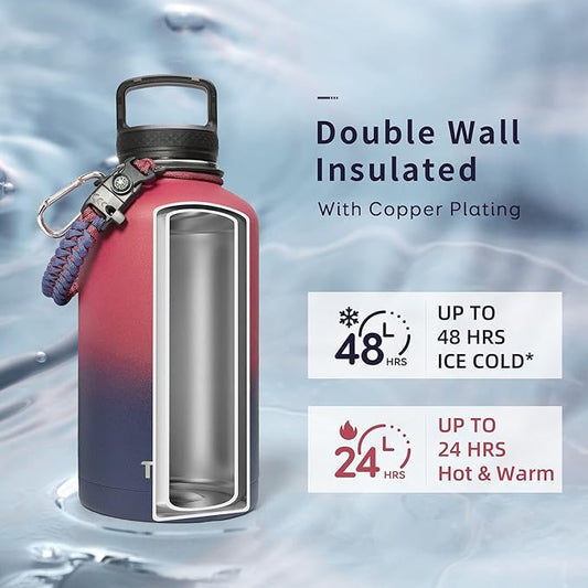 Trebo Insulated Water Bottle 64 oz, Half Gallon Metal Vacuum Water Jug with Paracord Handle and 3 Lids, Leakproof BPA-Free Flask for Gym Sports Hiking Travel, Keep Cold 48 Hours, Ruby Red