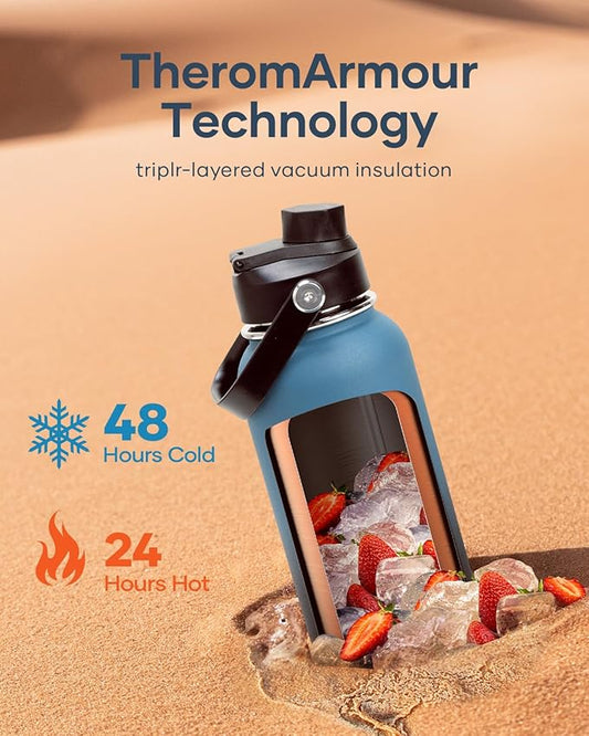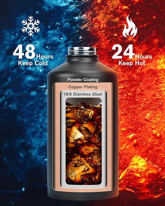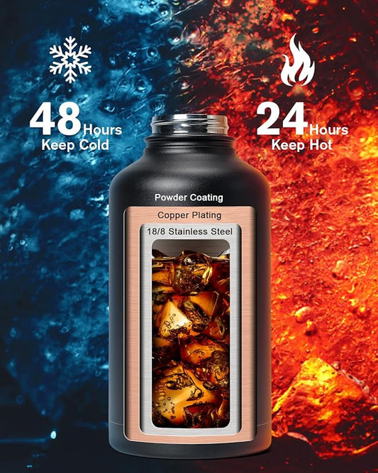 64 oz Insulated Water Bottle,Half Gallon Water Flask Stainless Steel Vacuum, Cold for 48 Hrs,BPA-Free & Leakproof -with Paracord Handle, Strap,Straw Spout Lids,Large Jug for Gym,Indigo Black