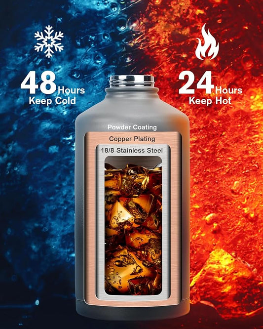 128 oz Insulated Water Bottle,One Gallon Water Flask Stainless Steel Vacuum, Cold for 48 Hrs,BPA-Free & Leakproof -with Paracord Handle, Strap,Straw Spout Lids,Large Jug for Gym,Grey