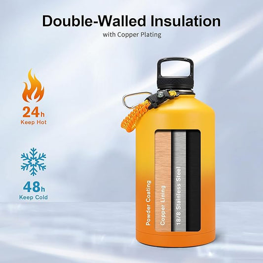 Trebo Insulated Water Bottle 64 oz, Half Gallon Metal Vacuum Water Jug with Paracord Handle and 3 Lids, Leakproof BPA-Free Water Flask for Gym Sports Hiking Travel, Keep Cold 48 Hours, Orange