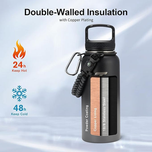 32oz Insulated Water Bottle,Stainless Steel Vacuum Water Bottle, BPA-Free & Leakproof -with Paracord Handle,Strap,Straw Spout Lids,Large Water Jug for Gym Sports