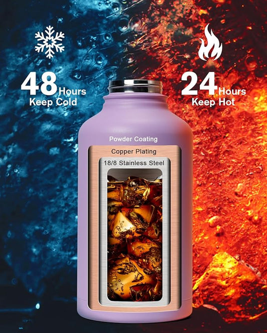 64 oz Insulated Water Bottle,Half Gallon Water Flask Stainless Steel Vacuum, Cold for 48 Hrs,BPA-Free & Leakproof -with Paracord Handle, Strap,Straw Spout Lids,Large Jug for Gym,Purple