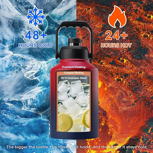 Trebo 1 Gallon Water Bottle Insulated with Paracord Handle and Straw,128oz Vacuum Double Wall Stainless Steel Large Jug,Keep Ice Cold 48hrs, Leakproof Sports Gym Flask for Men Women, Ruby Red