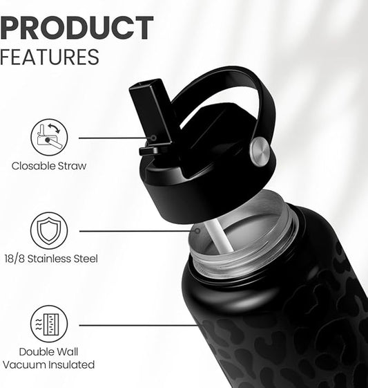 24oz Insulated Water Bottle with Straw, Stainless Steel Metal Vacuum Water Flask, Large Thermal Water bottle with Leakproof 3 Lids for Travel, Camping, Gym Sports Black