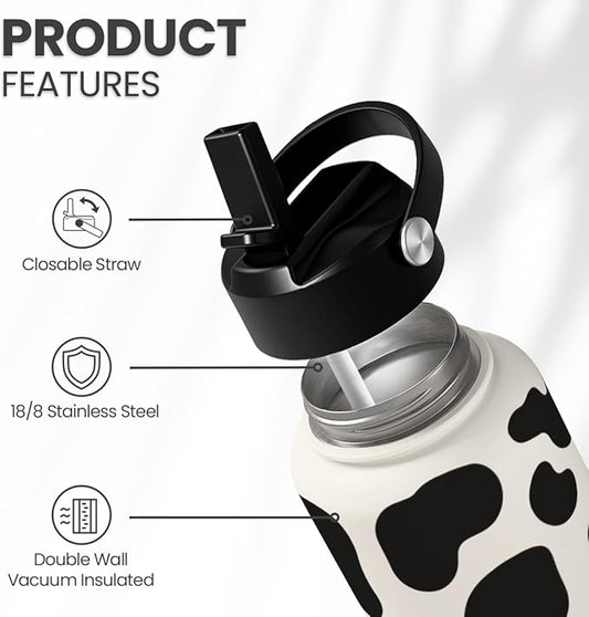 Cow Print Water Bottle 32oz Stainless Steel Vacuum Insulated with Lid, Cow Water Bottles for Gym Sports Travel Outdoor, Cow Gifts for Women Girls Birthday Christmas