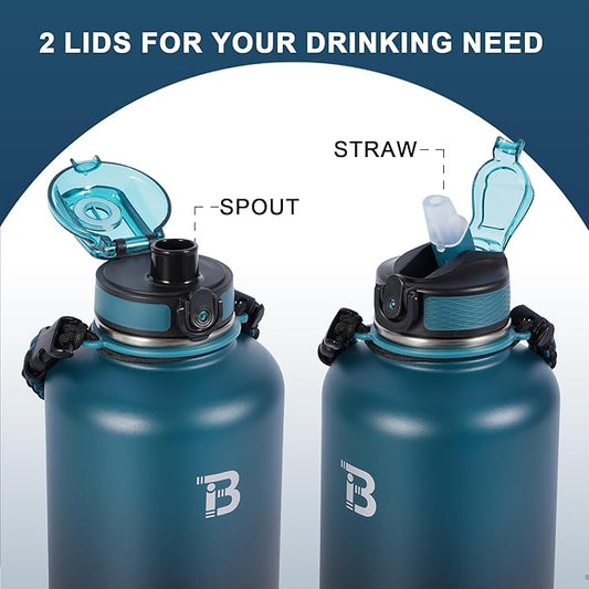 64oz Stainless Steel Water Bottles with Straw - Flex Lids, Shoulder Carrier Bag, Protective Cup Mat, 1/2 Gallon Metal Jug BPA Free, Vacuum Thermo Bottle for Women Men, Gym Outdoor Working
