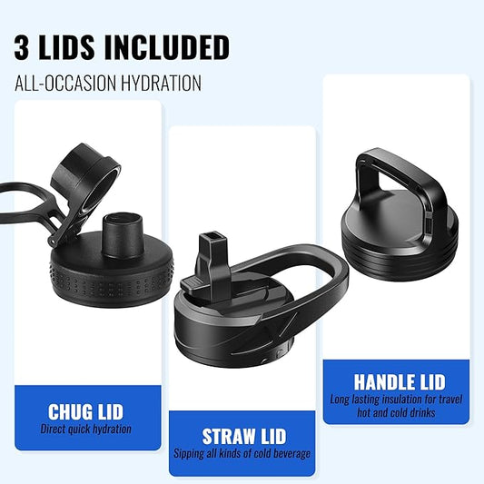 40oz Insulated Water Bottle with Straw, Stainless Steel Metal Vacuum Water Flask, Large Thermal Water bottle with Leakproof 3 Lids for Travel, Camping, Gym Sports Black