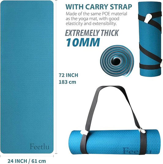 Extra Thick Exercise Yoga Mat with Strap - 2/5 Inch (10MM), Non-Slip Workout Mat for Yoga, Pilates, and Floor Exercises