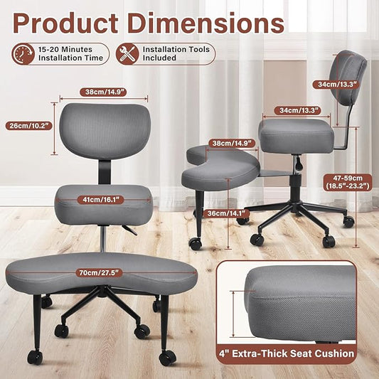 Ergonomic Cross Legged Office Chair, Criss Cross Chair for Meditation ADHD and Yoga, Home Office Desk Chair with Brake Wheels, Adjustable Height, Grey