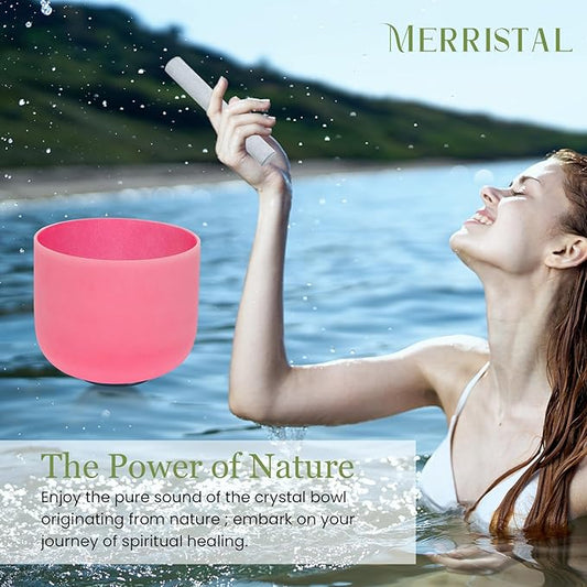 Singing Bowl 8 inch F Note Pink Color Heart Chakra Color Quartz Frosted Crystal Meditation Bowl Yoga Musical Instrument with Travel Bag Carrying Case Suede Mallet O-ring