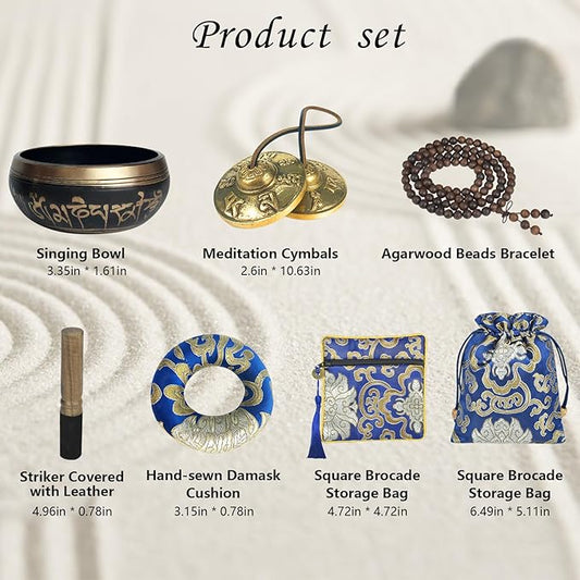 Artcome 7PCS Tibetan Meditation Set - Tibetan Singing Bowl & Tibetan Tingsha Cymbals Bells Handmade in Nepal for Meditation, Yoga, Tranquility, Relaxation, Chakra Healing, Stress Relief & Mindfulness