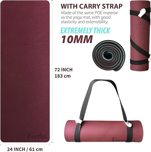 Extra Thick Exercise Yoga Mat with Strap - 2/5 Inch (10MM), Non-Slip Workout Mat for Yoga, Pilates, and Floor Exercises