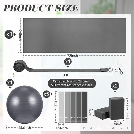 10 Pcs Yoga Starter Kit Include Yoga Mat with Carry Strap, 2 Yoga Blocks, Yoga Strap, Yoga Pilates Ball, 5 Resistance Bands with Air Pump Yoga Mat Set and Kit for Beginners Women and Men