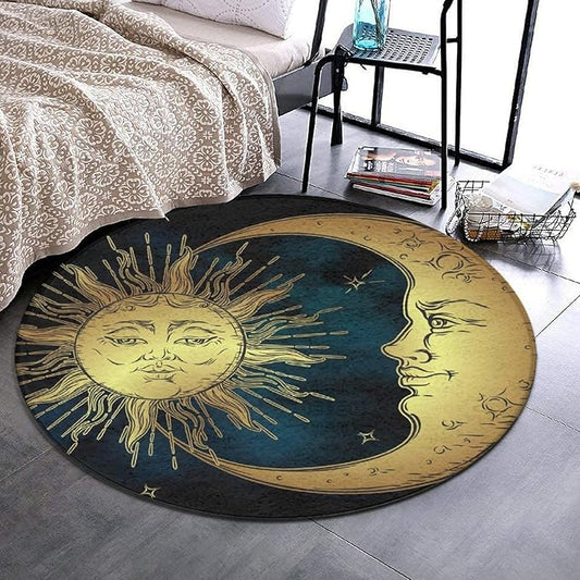 Large Home Decor Mat, Soft Round Yoga Carpet, Non-Slip Machine Washable Home Office Circle Rug Compatible with Boho Gold Sun Crescent Moon Star