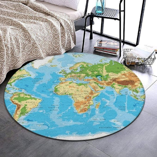 Soft Round Yoga Carpet, Large Home Decor Mat, Non-Slip Machine Washable Kitchen Office Circle Rug Compatible with World Map