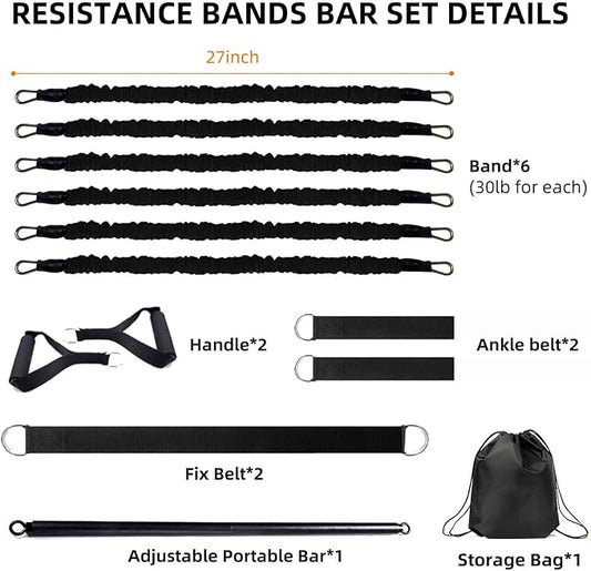 Portable Home Gym Workout Equipment, Push Up Board, Pilates Bar & Fitness Accessories with Resistance Bands for Upper Body Strength Training Full Body Workout at Home