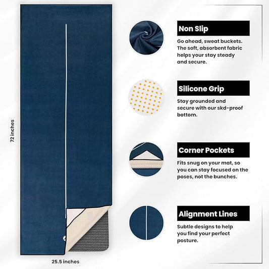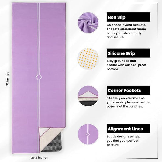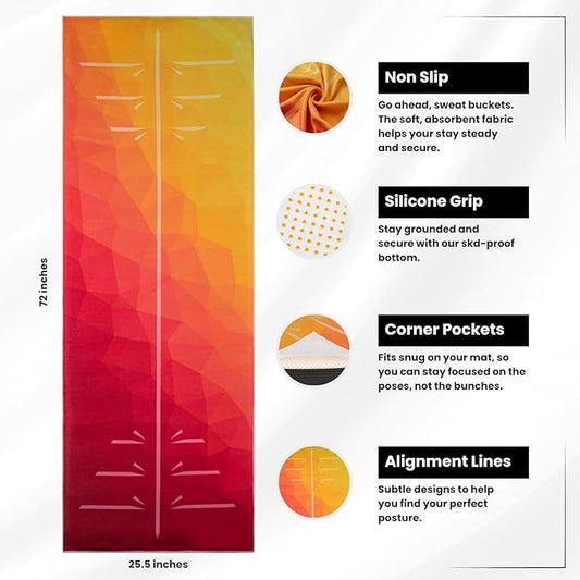 Yoga Drip Yoga Towel - Non Slip Hot Yoga Mat Towel With Corner Pockets, No-Skid Grip, and Built-in Alignment Lines | Soft, Moisture Wicking, and Sweat Absorbent | No Bunching, Stays in Place 72" x 25"