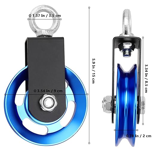 2 Pack 3.5 Inch Cable Pulley Wheel, Aluminum Cable Pulleys with Hanging Strap and Snap Hook, 360° Rotation Snatch Block Pulley Wheel for Home Gym Equipment, DIY, Blue