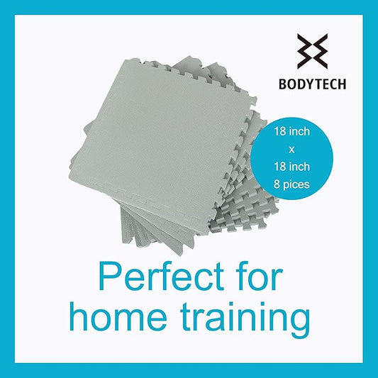 BODYTECH Puzzle Exercise Mat Interlocking Foam and Tile Mats for Home Gym. Floor Padding for Small Child. Gray Color 18 x 18 x ½ Thick 8 Sheet 18 SQFT