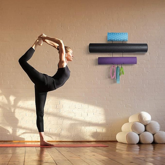 Wallniture Guru Yoga Mat Holder Wall Mount with 3 Hooks for Hanging Yoga Strap, Resistance Bands, 5-Sectional Metal