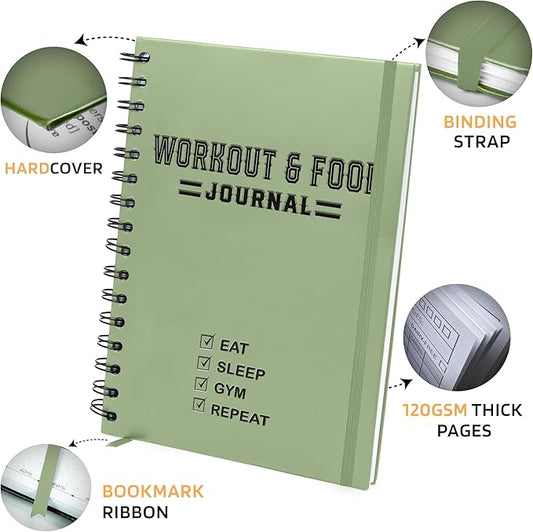 Nextnoid Hardcover Fitness & Food Journal - Workout & Meal Planner Notebook for Men & Women - A5 Sturdy Food Log Journal to Track Diet, Gym & Home Workouts - Green