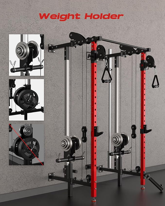 Folding Power Rack, Wall Mounted Squat Rack with Dual Independent Pulley System, Multi-Function Power Cage with 5 Adjustable Function Modes, Power Rack Trainer for Space Saving Home Gym