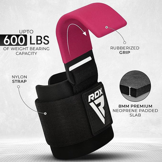 RDX Weight Lifting Hooks for Deadlifting (Pair) - 600Lbs Capacity - 8MM Neoprene Wrist Support Wraps - Grip Enhancer for Pull Ups Lat Pulldowns Rows - Adjustable Gym Workout Power Straps for Men Women
