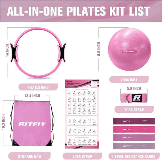 RitFit Pilates Kit - 14 Inch Pilates Ring Magic Circle with Pilates Ball, Resistance Bands & Yoga Strap, Pilates Equipment for Home Workout Toning Thighs, Arms and Core (Black/Pink)