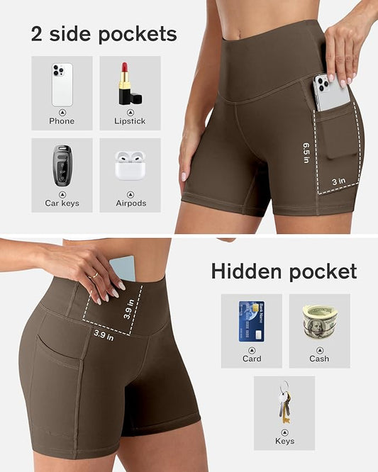 CHRLEISURE Womens Biker Yoga Shorts with Pockets: High Waisted Tummy Control Spandex Workout Athletic Gym Shorts 4 Packs