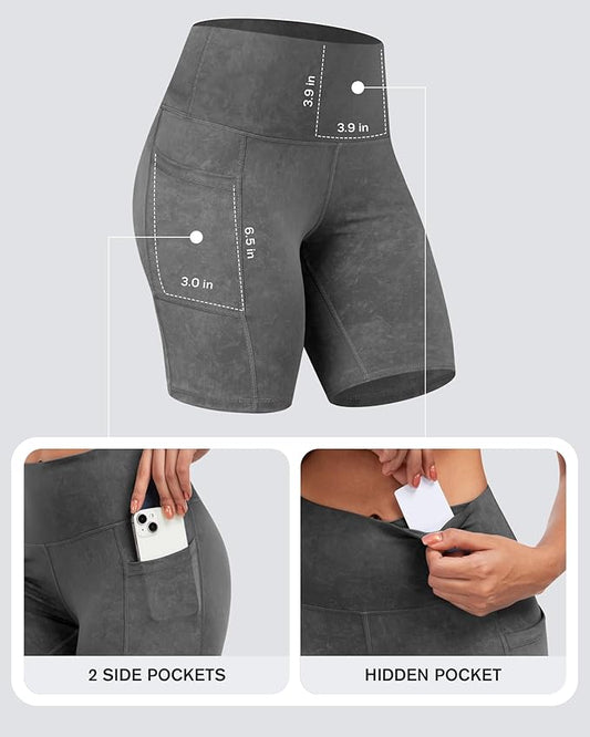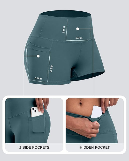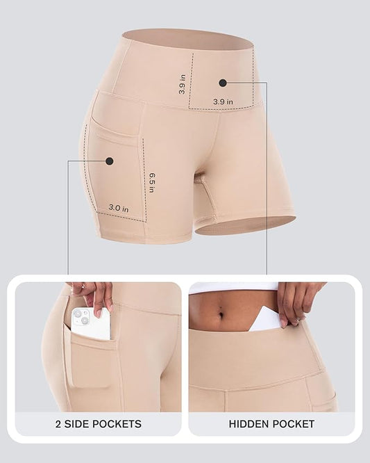 CHRLEISURE Womens Biker Yoga Shorts with Pockets: High Waisted Tummy Control Spandex Workout Athletic Gym Shorts 4 Packs