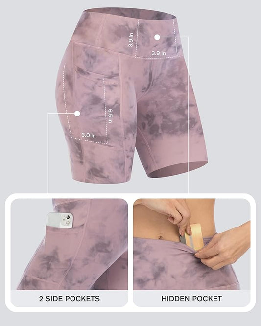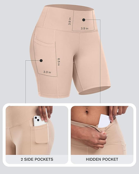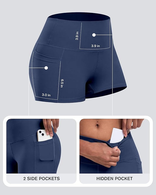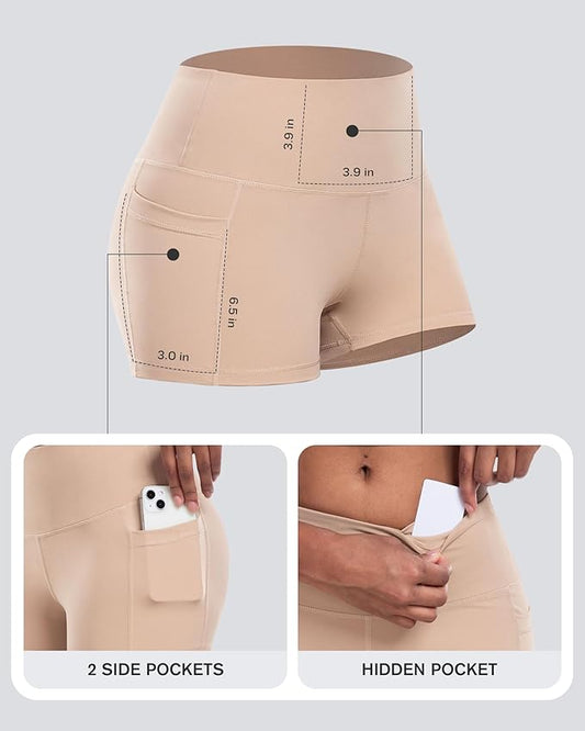 CHRLEISURE Womens Biker Yoga Shorts with Pockets: High Waisted Tummy Control Spandex Workout Athletic Gym Shorts 4 Packs