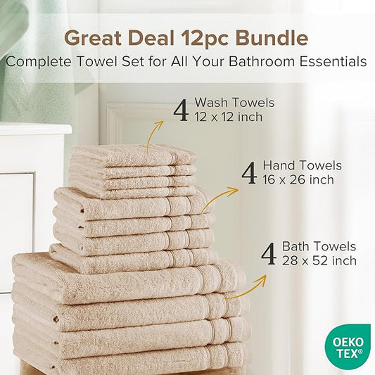 Comfort Spaces 12-Piece Luxury Bath Towel Set - 4 Large, 4 Hand, 4 Washcloth, 100% Cotton, Quick Dry, Zero Twist, Soft, Lightweight - Beige Tan