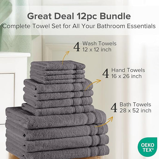 100% Cotton Bath Towel Set of 12-4 Bath Towels, 4 Hand Towels, 4 Wash Cloths, Sustainable, Soft, Highly Absorbent, Combed Cotton 12 Piece Set for Hotels, Spa, Bathroom, Dorm, Grey