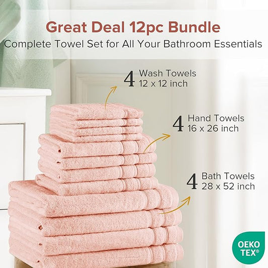 Comfort Spaces Towel Set for Bathroom 12 Piece Luxury Bath Towel Set 4 Hand Towel for Bathroom 4 Washcloth 4 Large Bath Pink Towel Sets 100% Cotton Quick Dry Towel Zero Twist Soft Lightweight Blush
