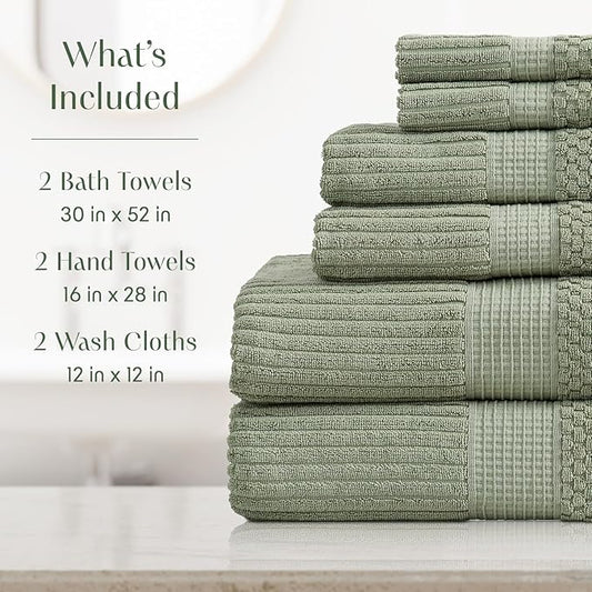Springtree Home 100% Cotton Towel Set | 6 Piece Set | Super Soft & Absorbent Quick-Dry 2 Bath Towels 2 Hand Towels & 2 Washcloths | Textured and Durable Cotton | Krista Collection - Lily Pad Green