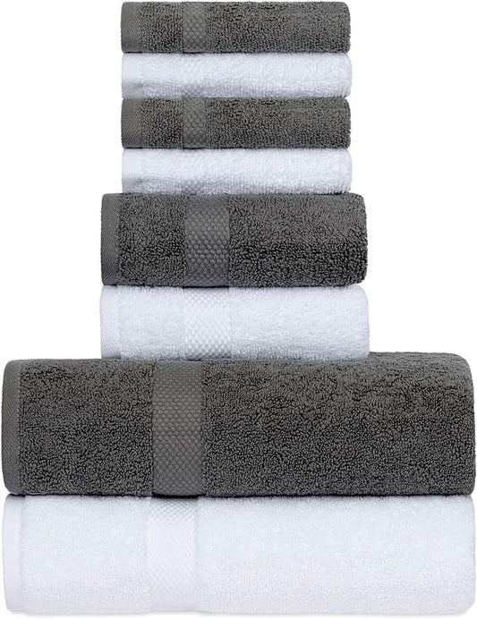 Luxury Bath Towel Set of 8 Pieces - 100% Turkish Cotton Highly Absorbent Towels for Bathroom, 2 Luxury Bath Towels 700GSM, 2 Hand Towels, 4 Washcloths, Gray White