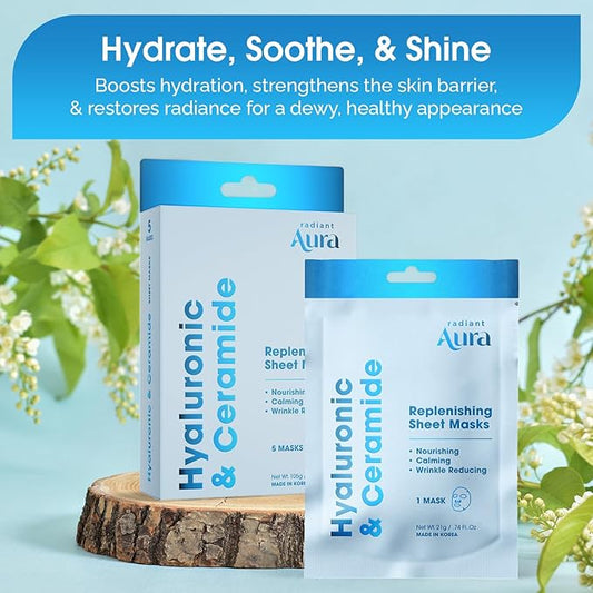 Hyaluronic & Ceramide Sheet Mask – Dermatologist Tested Korean Face Mask for Hydration, Wrinkle Care & Skin Nourishment – Collagen Facial Sheet Mask for Calming & Smoothing – 5 Pack