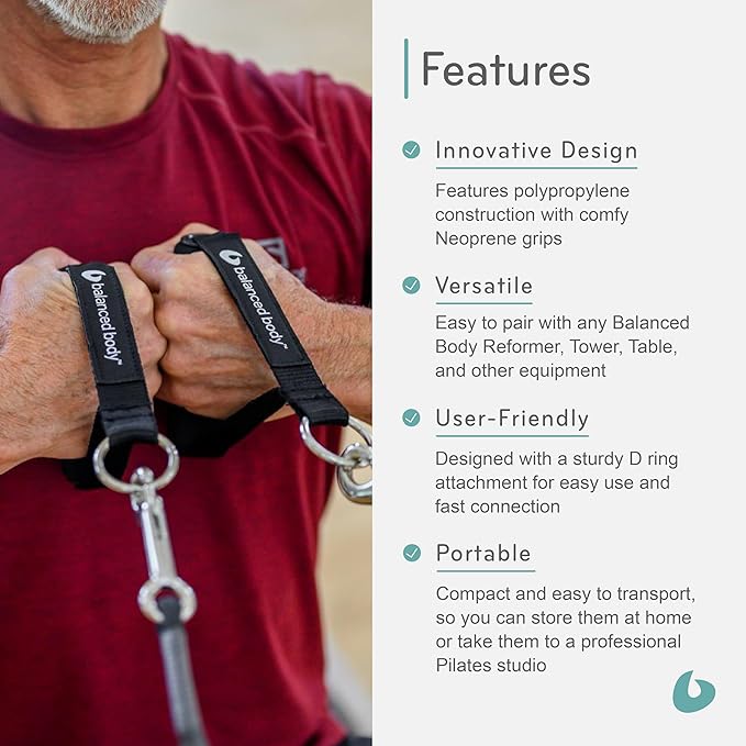 • VERSATILE ATTACHMENTS: Each handle measures 13" D x 4 9/10" W and includes a metal D-ring attachment. This set is designed to attach to a wide variety of Pilates machines to ensure compatibility with Balanced Body’s extensive range of products.