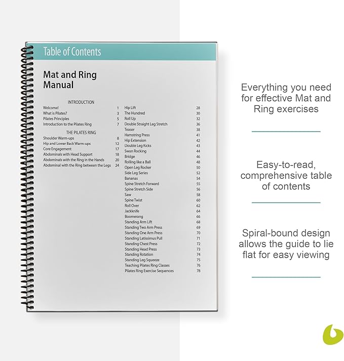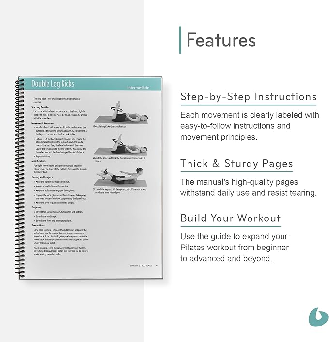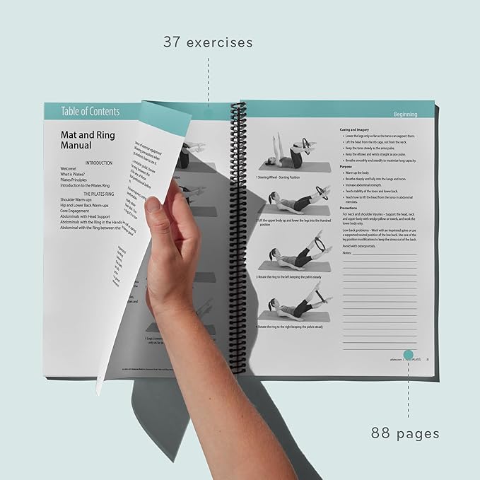 • PILATES EQUIPMENT GUIDE: Maximize your Pilates workout with our Mat and Ring Guide. This useful exercise guide features 88 pages with 37 exercises, full-color pictures, and step-by-step instructions so you can get the most from your floor workout.