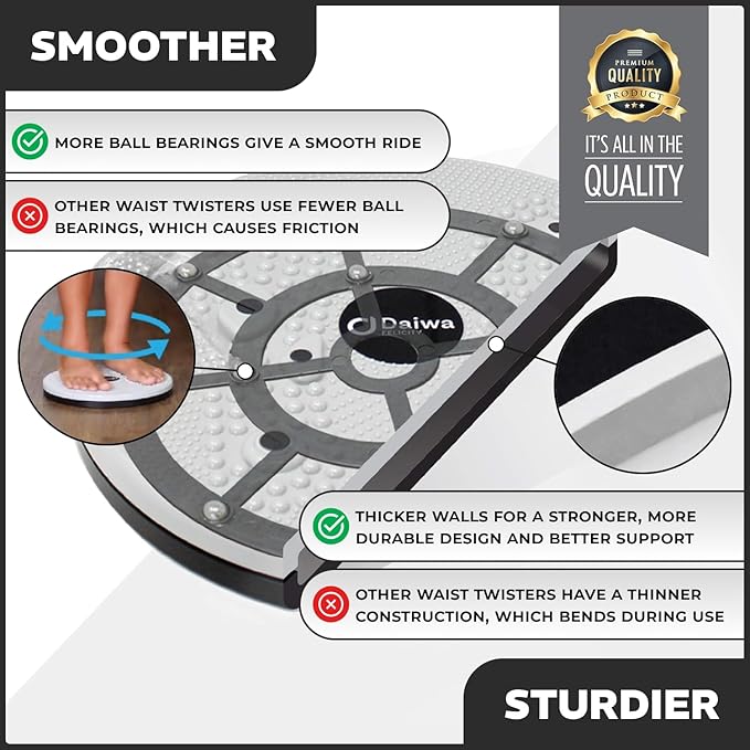 • 💪 𝗖𝗼𝗺𝗽𝗮𝗰𝘁 & 𝗗𝘂𝗿𝗮𝗯𝗹𝗲: Our Ab Twister Machine Waist exercise equipment stands out with its compact design and durable build. Unlike competitors with thinner plastic boards, ours features thicker walls for enhanced durability. While others offer fewer ball bearings leading to friction, ours boasts more ball-bearings in a gliding swivel that ensures smooth, friction-free rotation, making every workout session effortless and enjoyable.