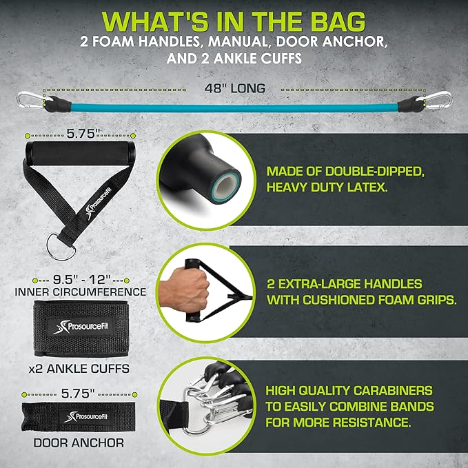 • CUSTOMIZABLE - 4 color-coded bands can be used individually, or combined to provide up to 14 levels of resistance and up to 56 pounds: Green (5-8 lb), Red (8-12 lb), Blue (12-16 lb), Black (16-20 lb); 48-inches each.