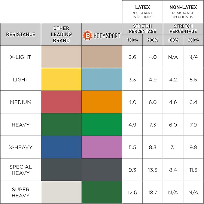 • NOT MADE WITH NATURAL RUBBER LATEX. The Body Sport Exercise Bands are not made with natural rubber latex and have no scent or powder