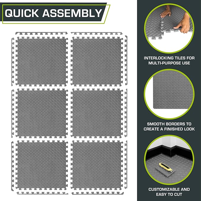 • Versatile – The water-resistant, noise-reducing design is easy-to-clean, great for indoor purposes like in garages as a protector, gyms, a home fitness room, or even children’s play areas as a playmat.