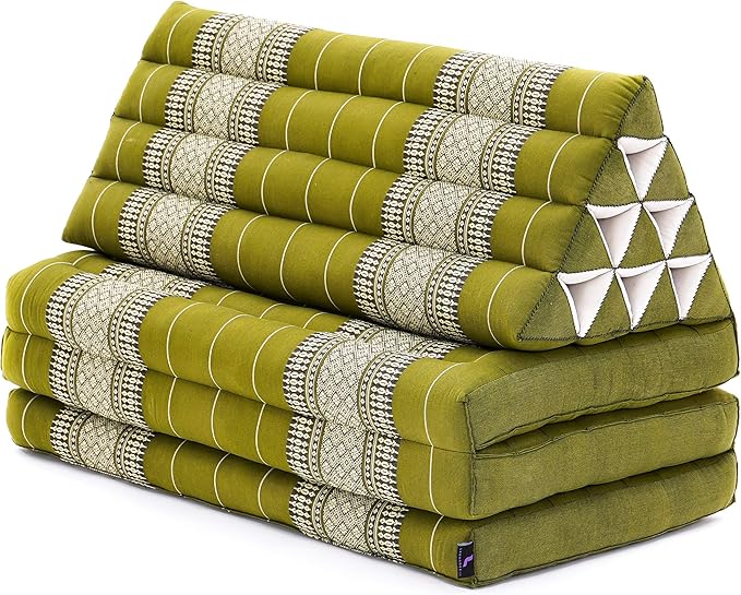 • Trifold Mat with integrated Thai triangle pillow. Ideal for reading, watching TV, gaming, or as a daybed. This floor pillow lounger doubles as a Japanese futon floor mattress or thai massage mat