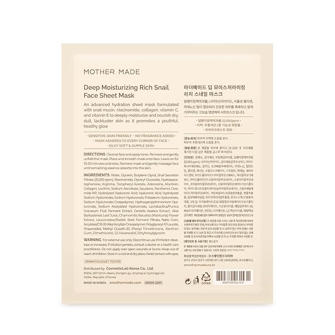 MOTHER MADE Glowing Glass Skin Hydrating Snail Deep Collagen Face Masks 10 EA, with Niacinamide 2%, Vitamin E, Facial Masks for Dry, Sensitive Skin, Kbeauty Essentials, Self Care, Korean Skincare