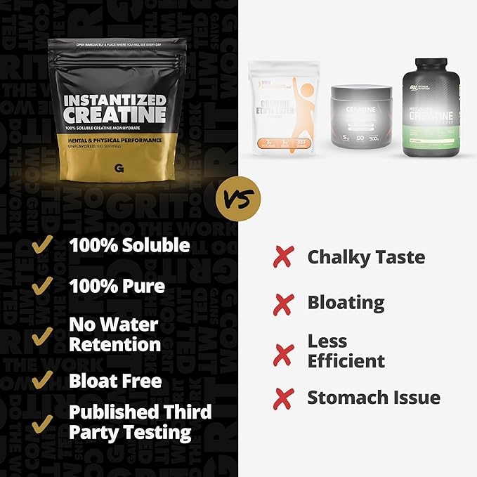 • INSTANTIZED CREATINE: Gains in Bulk Instantized Creatine is a 100% soluble creatine monohydrate powder, delivering all the benefits of creatine without the bloating, water retention, or gritty texture. Backed by research, it helps enhance muscle endurance, strength, and size for optimal performance.