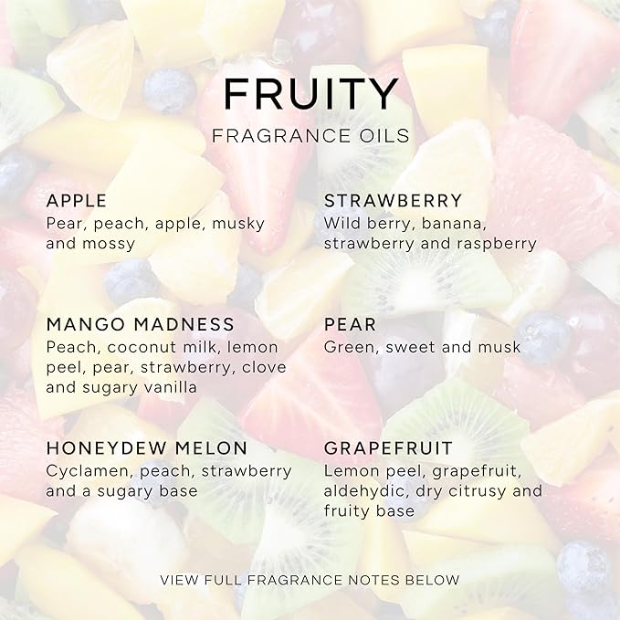 • FRUITY SCENTED OILS: Fresh fruity smelling scents formulated for making candles, soaps, air freshener sprays, aromatherapy diffusers, dryer sheets and cleaning products. These seasonal essential scents make the perfect gift for the whole family!