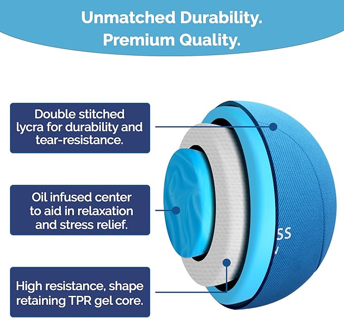 • Premium quality, ultra durable, larger sizing- Our ergonomic stress relief ball is made of a tear resistant gel core and sleek non-slip and non-stock fabric. Our inner core gel is oil infused with stimulating scents to aid in mindfulness, relaxation and stress relief.