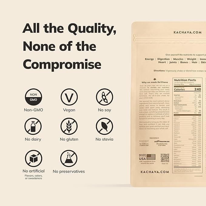 • FULL OF NUTRIENTS, NOT FILLERS: It's about what's inside – and what's not. Ka'Chava is non-GMO with no whey, no gluten, no soy, no dairy, and no artificial colors, flavors, or sweeteners. Just quality ingredients your body will love.