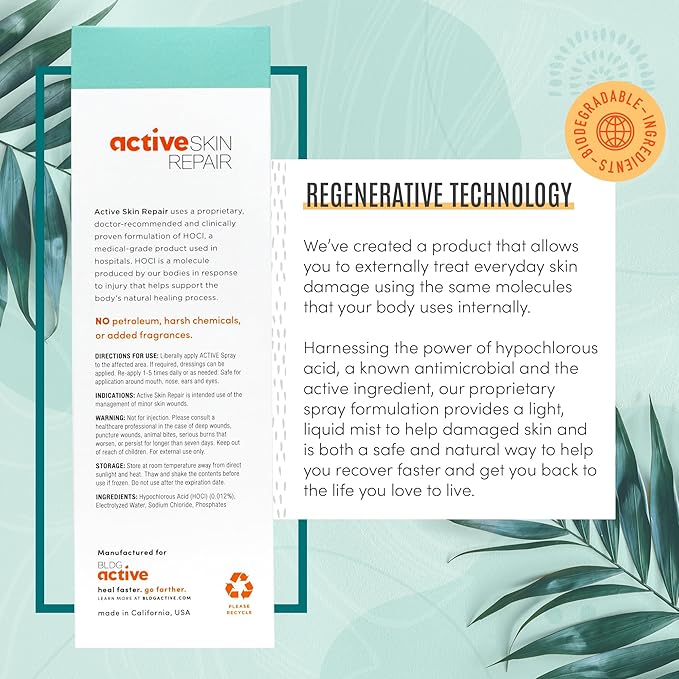 • FIRST AID HYPOCHLORUS ACID SPRAY: The technology used in Active Skin Repair is the same safe and gentle molecule used in hospitals and households worldwide; Hypochlorus Acid cleanse wounds to help skin recover faster